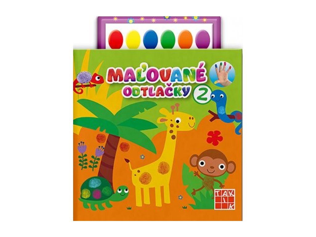 "Pršteky ušpinené od farby povolené, rozkošné obrázky pripravené a obrovské množstvo zábavy zaručené - to sú Maľované odtlačky!Ozdobiť slimačie ulity, pridať čerešňu na koláčik, skrášliť chvosty morským vílam či doplniť veveričkám a dráčikom chýbajúce brušká – to je len malá ukážka veselých kreatívnych úloh v Maľovaných odtlačkoch 2. Deti pomocou zafarbených prštekov doplnia telá postavičiek, zvieratiek a rôznych iných objektov. Zavítajú do džungle, lesa, na farmu, ale aj do vedeckého laboratória. Vycestujú do Mexika, na divoký západ aj do Egypta, kde ozdobia masku faraóna. Technika maľovania odtlačkami je prospešná obzvlášť v prípade menších detí, ktorých motorika ešte nie je dostatočne vyvinutá. Odtláčaním prštekov na papier si totiž posilňujú a precvičujú svaly na prstoch i zápästiach. Takýmto spôsobom vytvárajú krásne farebné obrázky a zároveň si cibria jemnú motoriku, sústredenosť, priestorové vnímanie aj predstavivosť. Súčasťou zošita sú farby na otláčanie. Maľované odtlačky 2 sú vhodné pre deti od 3 rokov."