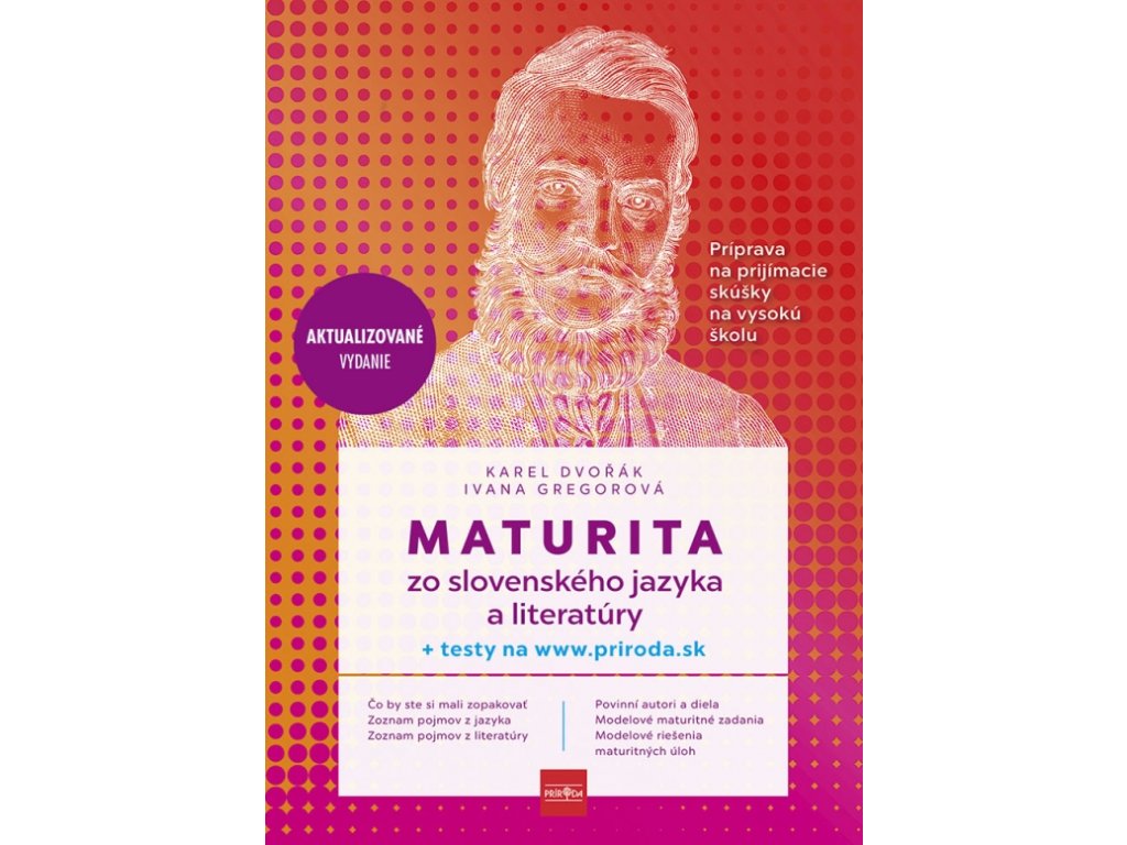 Príručka je určená študentom gymnázií a stredných odborných škôl, ktorí sa pripravujú na maturitnú skúšku zo slovenského jazyka a literatúry. Nájdu v nej 30 modelových maturitných zadaní zo všetkých oblastí jazyka a literatúry, ako aj informácie o súčasnej koncepcii maturitnej skúšky.Úlohy však prinášajú aj rozširujúce učivo, ktoré výborne poslúži všetkým uchádzačom o štúdium na vysokých školách so spoločenskovedným zameraním. Test prístupný na www.priroda.sk umožní študentom preveriť si svoje nadobudnuté vedomosti.
