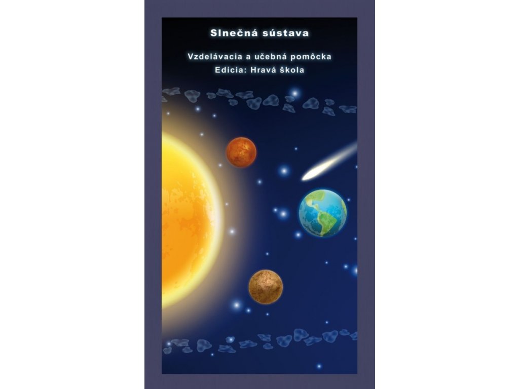 Vzdelávacia a učebná pomôcka z edície Hravá škola. Vzdelávacia a učebná pomôcka pre prírodovedné predmety. Učebná pomôcka graficky znázorňuje Slnečnú sústavu.Ide o úplne netradičný produkt v tzv. mapovom formáte, v rozloženom stave má titul rozmer 98 cm x 62 cm, v zloženom stave má rozmer 21 cm x 12,5 cm.
